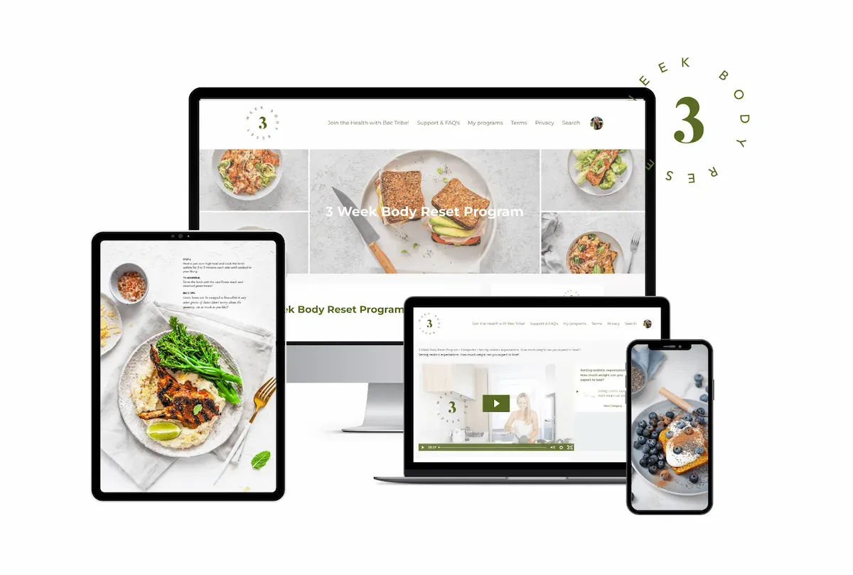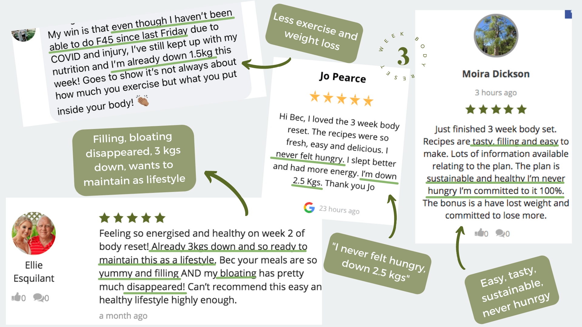 âAfter following Bec's 3 Week Body Reset Plan and continuing inside the Health with Bec Tribe, I have lost nearly 10 kgs! Bec's recipes and plans have completely inspired me. You never feel hungry and are always satisfied. Bec has literally changed my life! I'm in the best shape ever and food no longer has a negative hold over me."