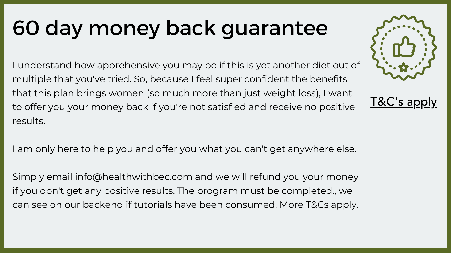 This program offers eating and lifestyle advice in accordance with the Health with Bec approach and philosophy. You will find expert eating and lifestyle advice from Bec (qualified Nutritionist, BScNutr.) however, whilst it can assist, it's not intended to replace or heal any medical conditions. If you have any major health conditions, please seek medical advice in conjunction with this lifestyle.