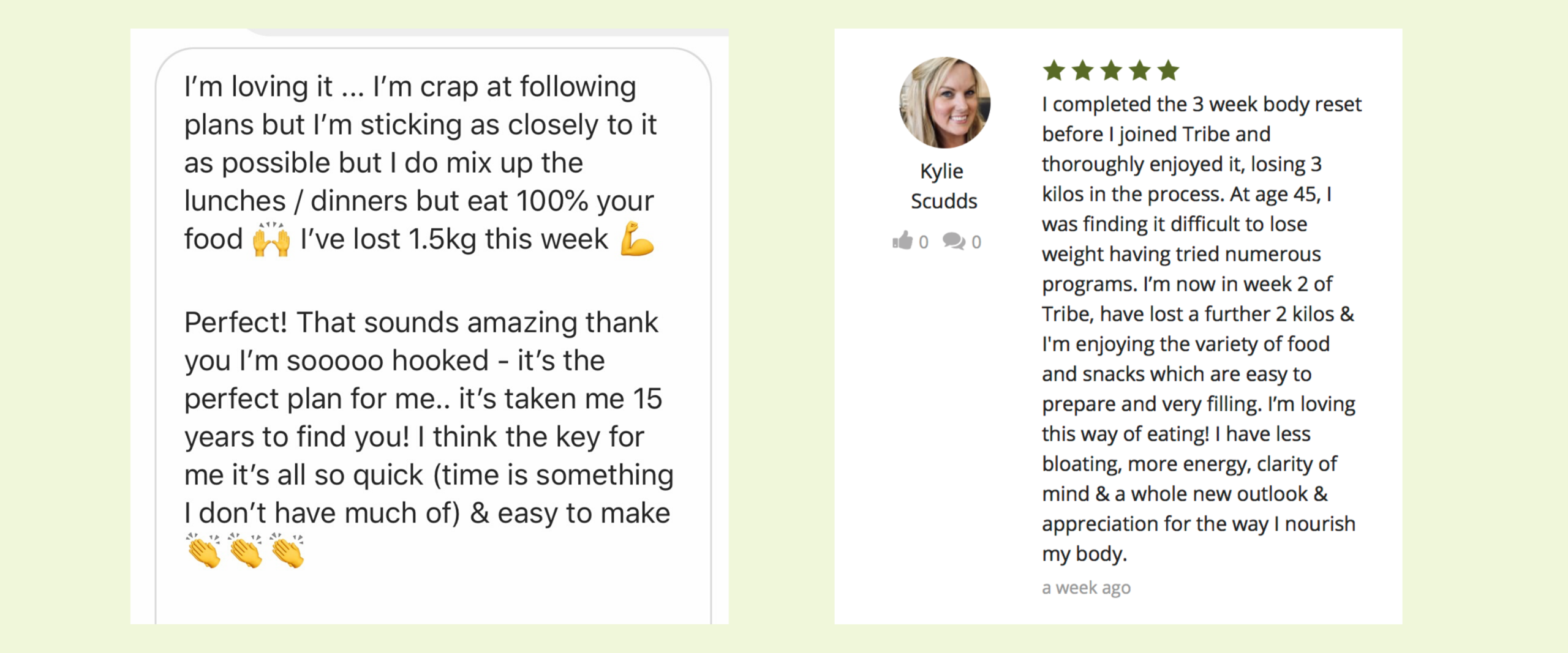 "After the 3 Week Body Reset, I felt a lot better than I had in a long time - no bloating, more energy and I finally started seeing my body change. The Tribe is an amazing addition and the inspirational women in there has made me want to work harder to achieve my goals."